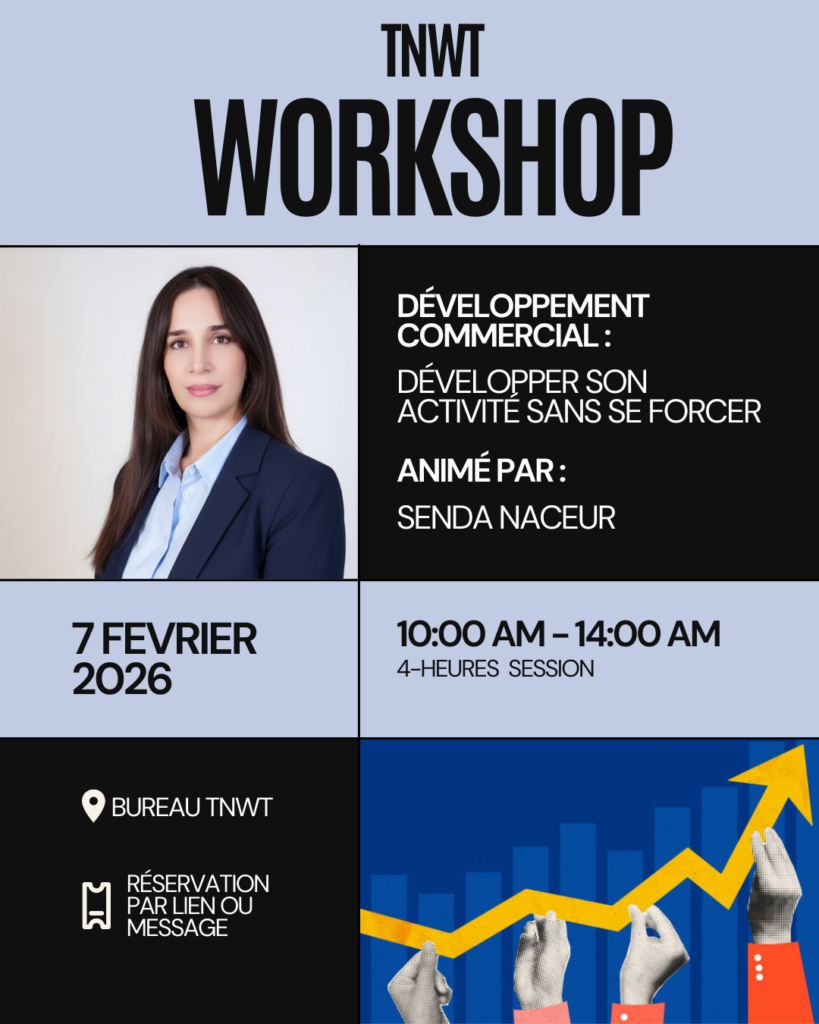 Le réseau The Next Women Tunisie vous invite à un Atelier de Développement Commercial, animée par Senda Naceur , membre du réseau et Fondatrice de RAKAN Evolution et Savoir.